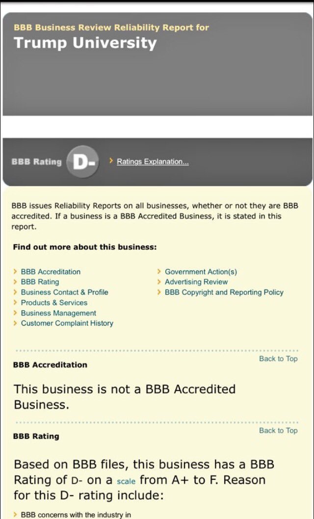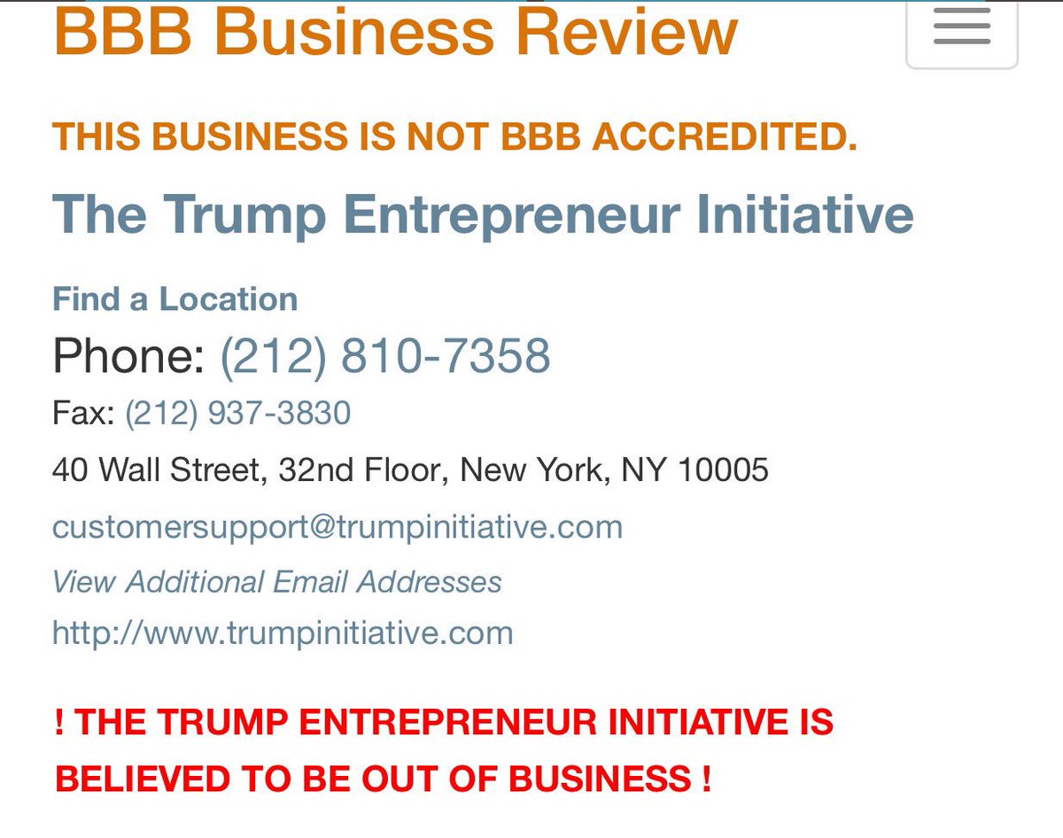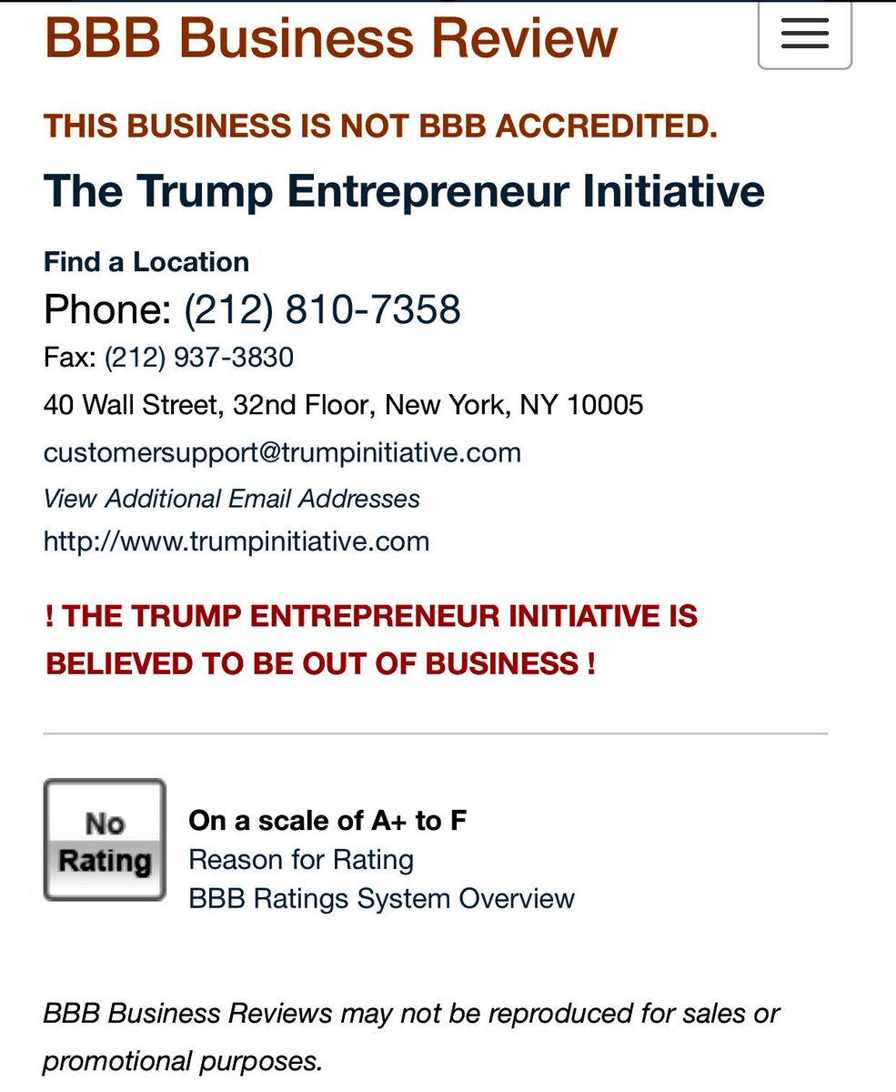 @realDonaldTrump http://www.bbb.org/new-york-city/business-reviews/training-programs/the-trump-entrepreneur-initiative-in-new-york-ny-97075/ … it has no rating. None. Zero. If it did it wouldn't matter.