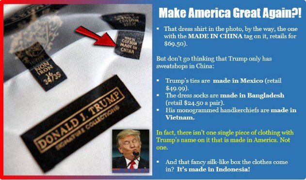Can U trust tRump? 5 factories outside USA making Trump clothes China,Mex,Indonesia,etc USA JOBS BS pic.twitter.com/J3r0xO7eu1