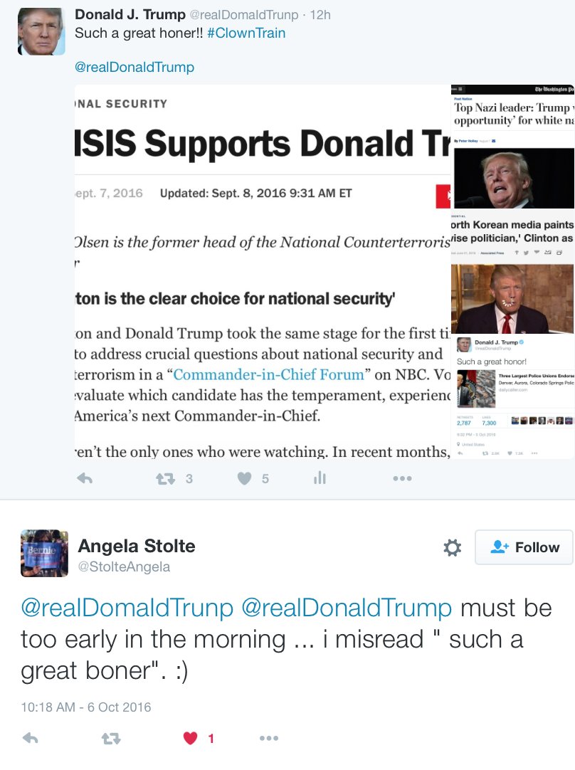 @StolteAngela, many people tell me I have the best, most luxurious boner! I bet lyin' Hillary doesn't even have one!#ThursdayThoughtspic.twitter.com/fzJMJuY6AI