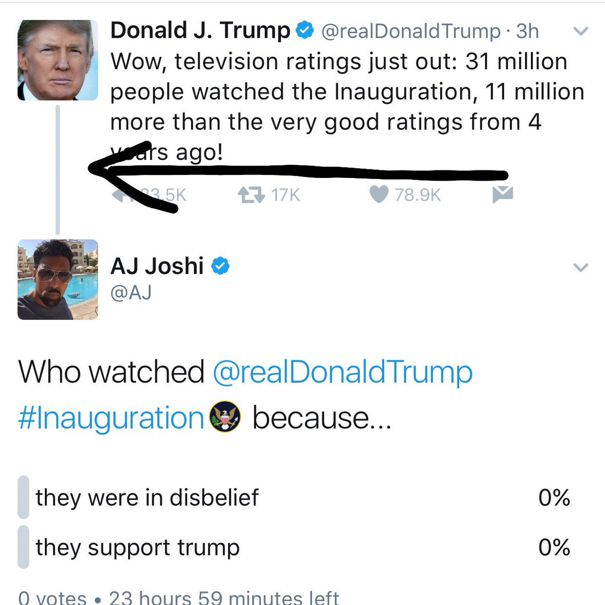 Wow, television ratings just out: 31 million people watched the Inauguration, 11 million more than the very good ratings...pic.twitter.com/EYq61XJfE3