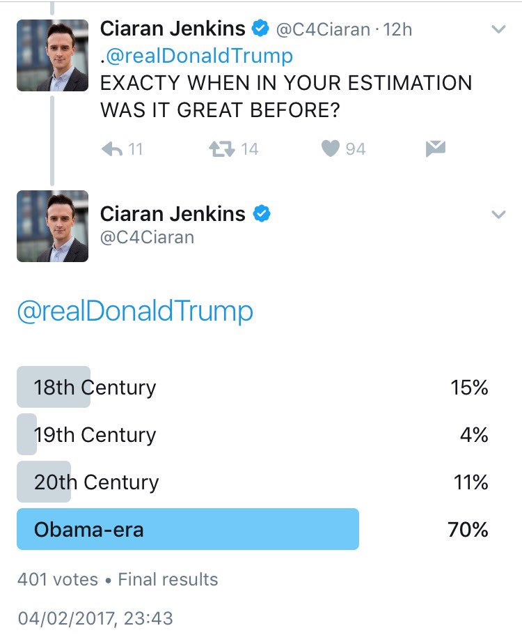 The other fascists would like their slogan back -- the one you stole from Ronald Reagan.pic.twitter.com/wB20gHma0f