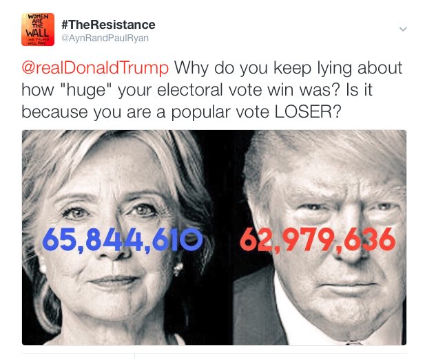 Tends to forget lost the popular vote. Not liked as much as he thought. Guess that kinda hurts. Get over yourself.