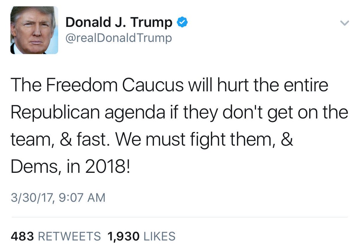 Trump is threatening to fracture the Republican Party if the Freedom Caucus doesn't compromise on its principles.pic.twitter.com/1l5S6fDe0f