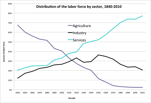 "Industry" jobs wiped out farmers. Tech & automation ("Service" sector) is currently wiping out factory workers. Why can't you see this?