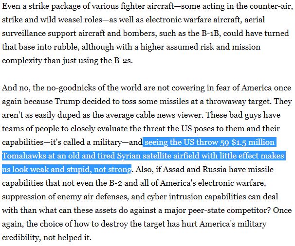 Please stop lying. You could have destroyed the airfield with bombers. Using Tomahawks was a pointless PR exercisehttp://bit.ly/2oZqyDo