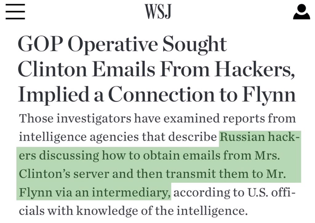 @WSJ just released intel agency reports that Russia SENT CLINTON'S HACKED EMAILS to Mike Flynn during election! -