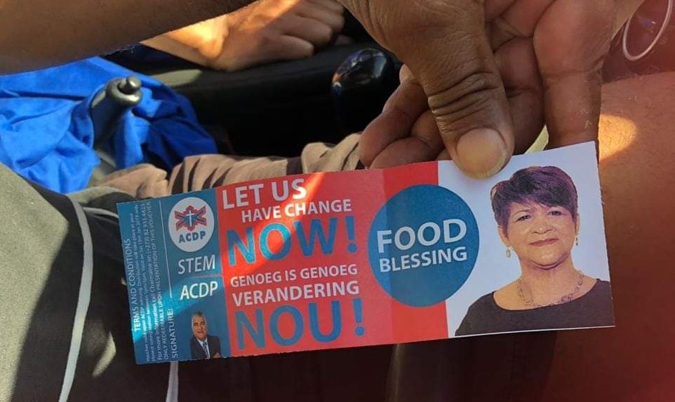 The #ACDP in the Western Cape has turned to #ANC-esque vote buying tactics in the Ward 31 by-election (Cape Town). Luring votes with meal vouchers, of course, "only of they win". Disgusting behavior by @RevMeshoe's party. Vulnerable people are still being manipulated with food.pic.twitter.com/tneGNOrT4F