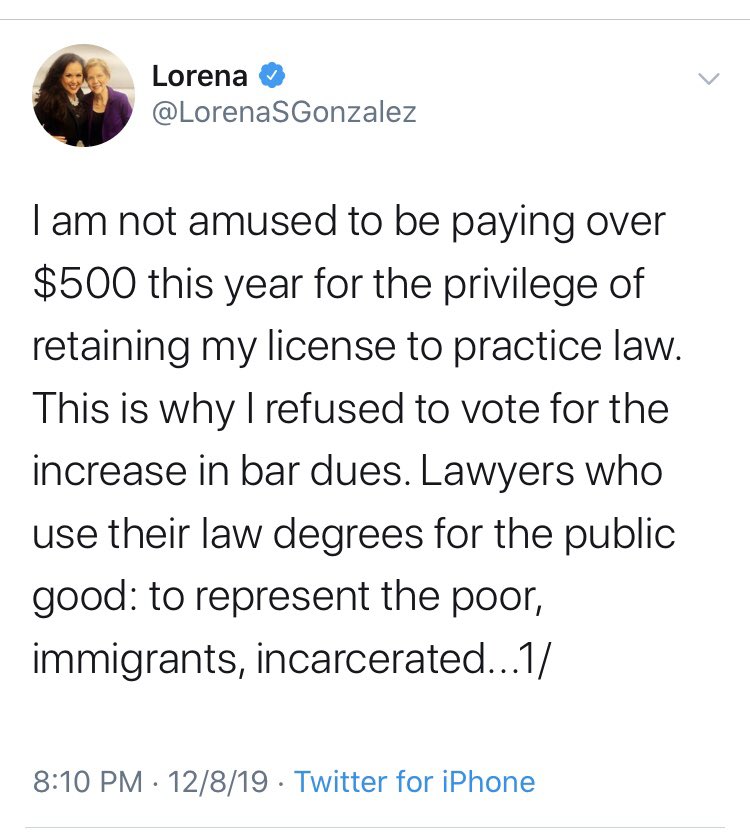Meanwhile, Lorena is crying cause she has to pay $500 for CA bar dues. PEOPLE HAVE LOST THEIR JOBS and she’s whining for $500. pic.twitter.com/4VuDCPD30M