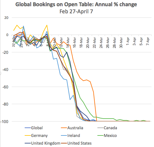 This synchronicity of the decline in restaurant bookings around the world—or, at least, among OECD nations with OpenTable—is remarkable. Different distancing policies. Different outbreak rates. Different cultures. Different laws. And they all fell to zero in 15 days.pic.twitter.com/zPyIWAGv1y