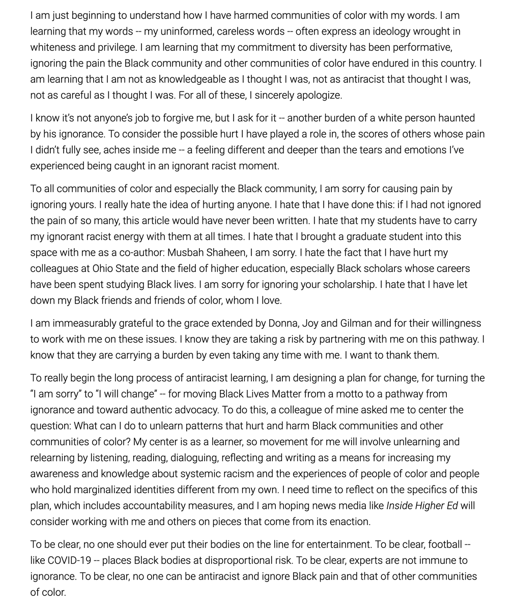 Here we see that a Critical Race Theory struggle session has successfully extracted a groveling public apology from someone for writing an article titled "Why America Needs College Football." It wasn't racist at all, yet the cult demands repentance. https://www.insidehighered.com/views/2020/09/29/author-apologizes-inside-higher-ed-article-he-recently-wrote-opinion …pic.twitter.com/uoZ0uOwKKy