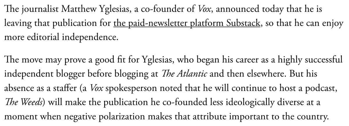 My perhaps controversial view is that within-publication "ideological diversity" is at most as good as, perhaps worse than, and clearly less viable than, between-publication diversity. https://www.theatlantic.com/ideas/archive/2020/11/substack-and-medias-groupthink-problem/617102/ …pic.twitter.com/s0cweygMI5