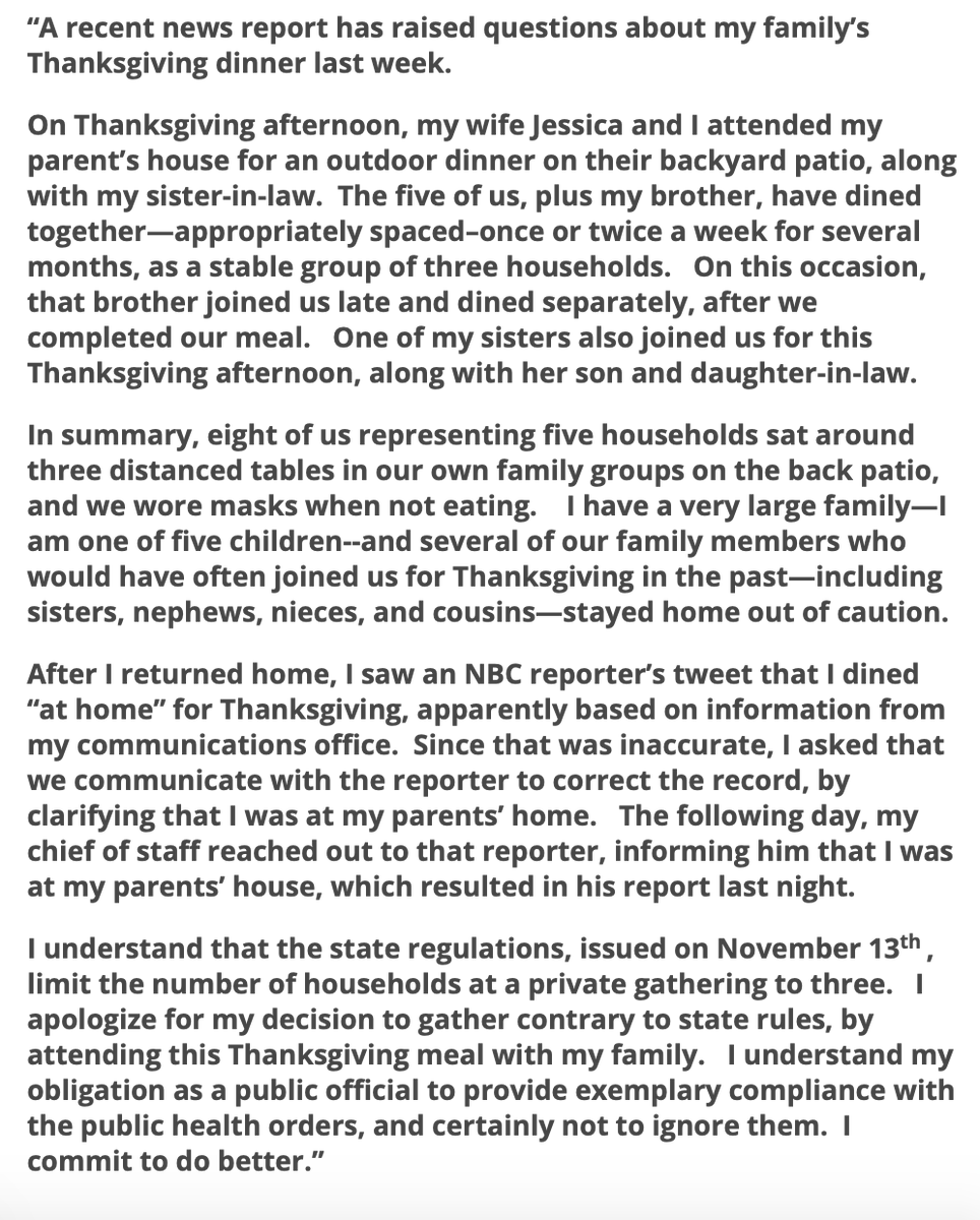 I apologize for my decision to gather for Thanksgiving with my family, contrary to the rules. I understand my obligation as a public official to provide exemplary compliance w/ public health orders, & not to ignore them. I commit to do better. My statement:pic.twitter.com/LFhX2LCUf3