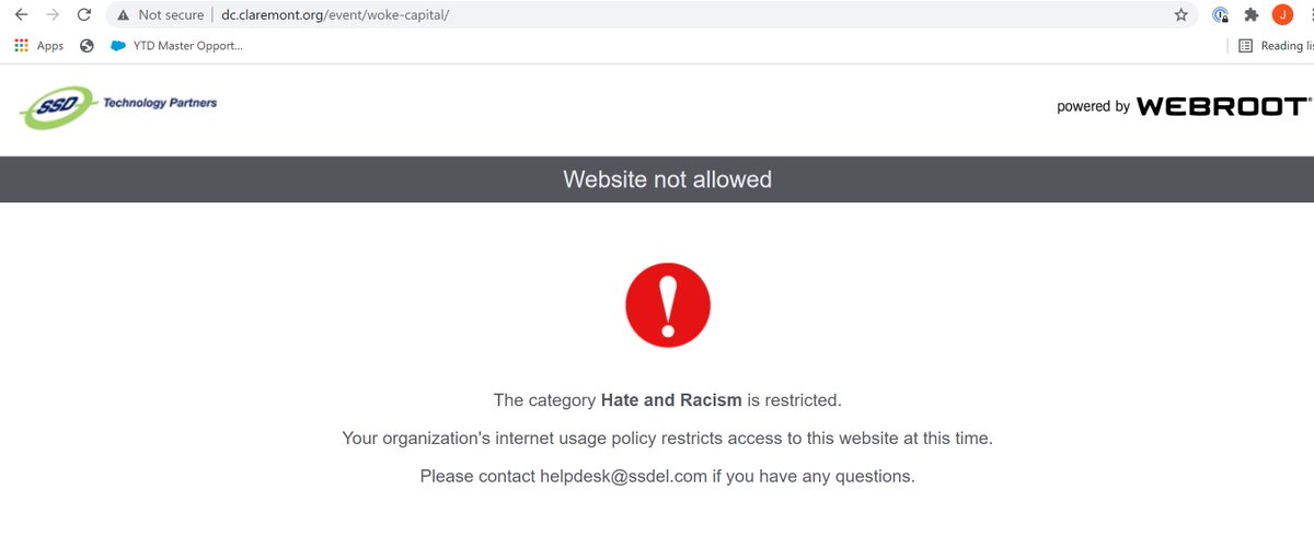 I went to sign up for @ClaremontInst's event on Woke Capital feat. @JDVance1, @RepJimBanks, @realchrisrufo, and @ToryAnarchist, and the landing page was blocked for "Hate and Racism," by our cybersecurity company. This is baseless! @Webroot, please #unblockClaremontpic.twitter.com/VICXxVgJcl