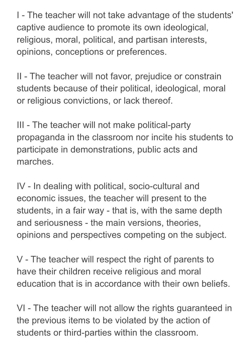 The movement also had a draft law that required schools to put up a poster with the six “duties of the teacher” in all classrooms, so that students could get to know them; and made clear the right of students and parents to record the classes. These are the six duties:pic.twitter.com/8K05M1v2Ow