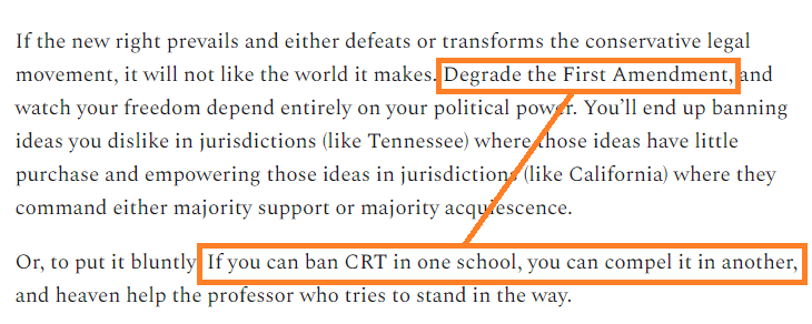 The reason why my essay swept beyond public K-12 is that the new right legal tactics have swept beyond public K-12. The Trump EO, for example. Proposals targeting colleges. All with similar provisions. But your characterization of my K-12 position as “surrender” was just wrong.