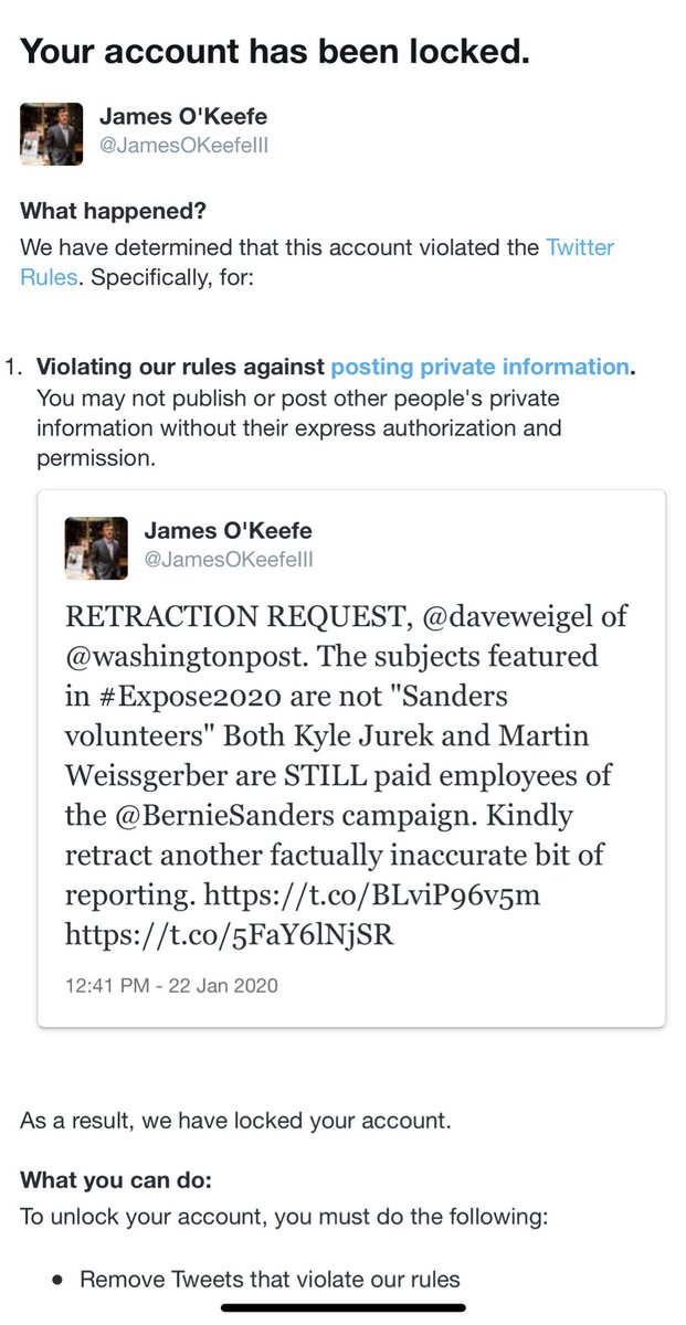 @JamesOKeefeIII's account has been locked after asking for a retraction from the Washington Post story in which they called Bernie's paid employees "volunteers".pic.twitter.com/kvoGJQGK2w