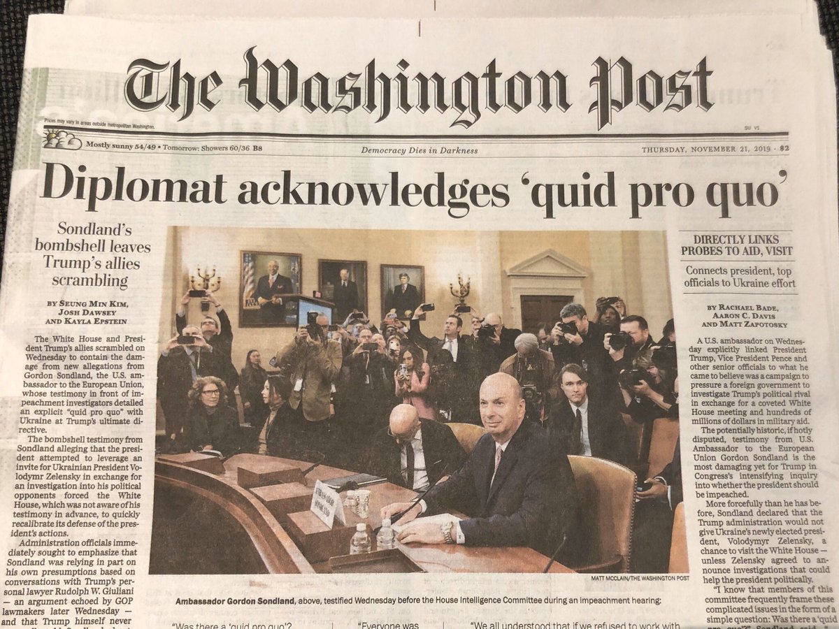 ....Sondland said Trump told him. None of this will move the needle for anyone. And now Dems in Swing Districts head home for Thanksgiving to hear from voters. Pelosi & Co. are putting on a show to appease the Democratic base instead of doing the work ALL Americans need done.”