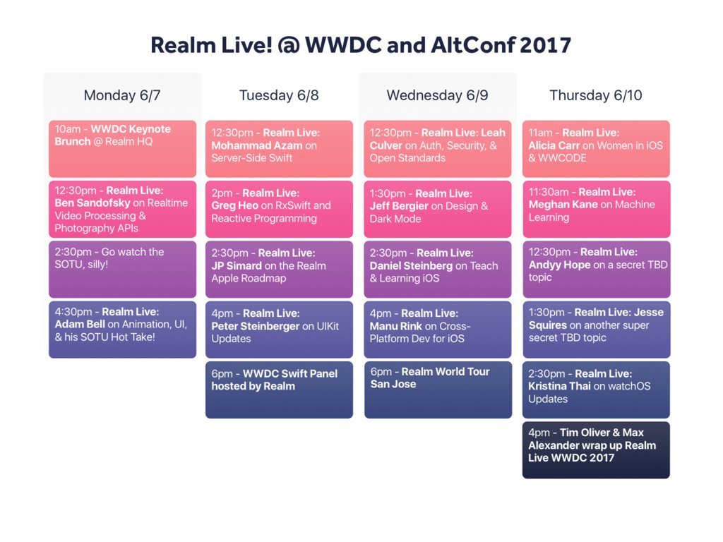 #WWDC and#AltConf and catch up with any streams you may have missed! https://news.realm.io/news/live pic.twitter.com/szNwsNv4c2