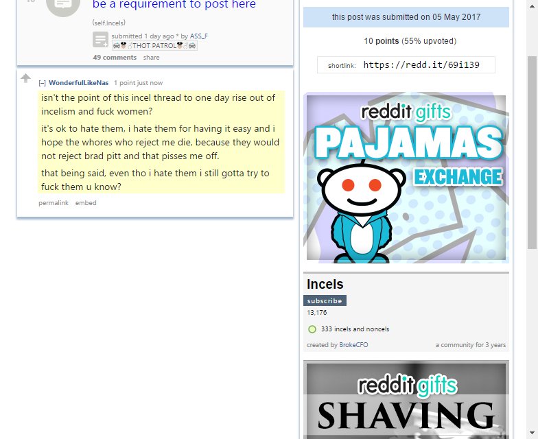 Incels: isn't the point of this incel thread to one day rise out of incelism and fuck women? it's http://np.reddit.com/r/Incels/comments/69i139//dh86rxq …pic.twitter.com/e7DiiJk8TP