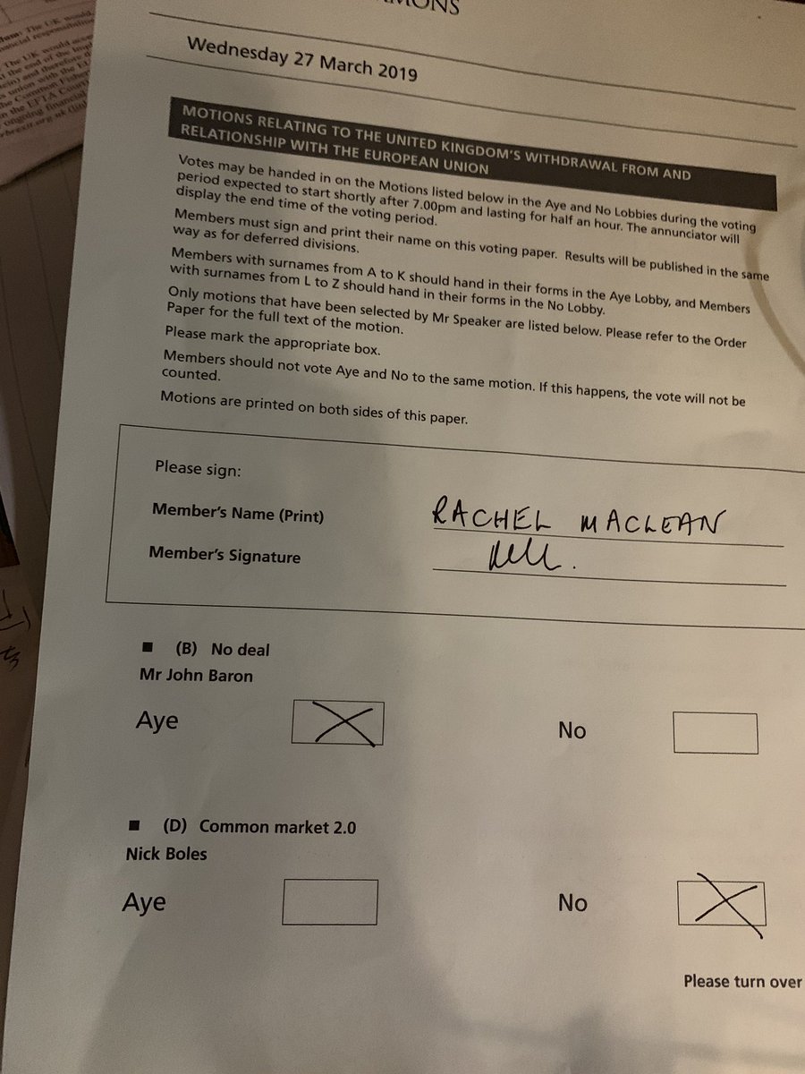 BTW Just as a reminder your options were 2 of the lowest [except EEA/EFTA [without Customs Union]. You voted B - Yes 160 No 400 - Leave the EU with no deal O - Yes 139 No 422 - If no withdrawal agreement agreed, seek standstill agreement with EU while negotiating trade deal.