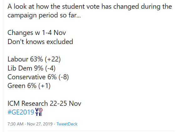 A sharp rise in voter reg, predominantly among young people, has boosted Labour’s hopes in the GE More than 3 million people have registered since the election was called on 29 October. More than two-thirds of applications are from under 34's, who tend to be more towards Labourpic.twitter.com/0PFZqG757l