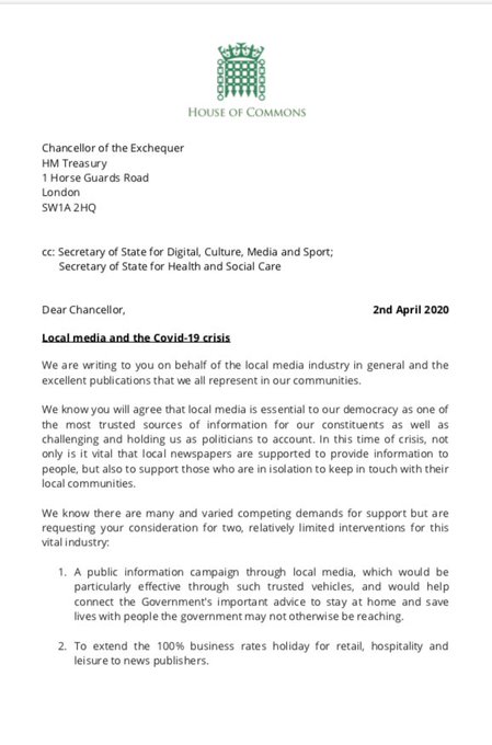 A cross-party group of 23 Yorkshire MPs has written to the Chancellor calling for the Government to support local newspapers by placing a public information campaign and by extending the 100% business rates holiday for the retail and leisure industries to local publishers pic.twitter.com/m2eODtXkk0
