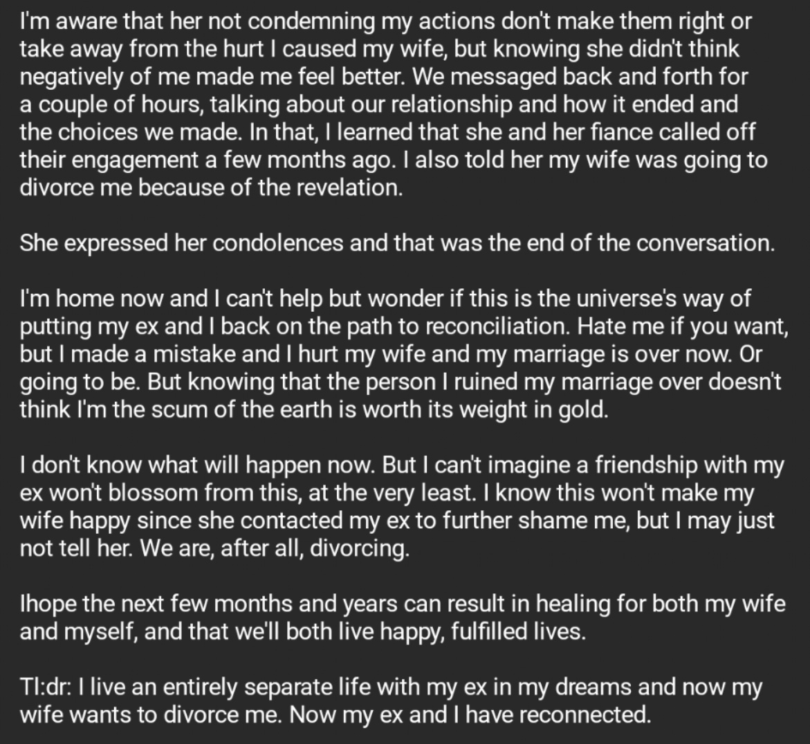 UPDATE: My M 31) Wife (28) Wants A Divorce Because I Live An Entirely Different Reality With My First Love (F29) In My Dreams https://www.rareddit.com/r/relationships/comments/l1p1wb …pic.twitter.com/ozNpWah9bt