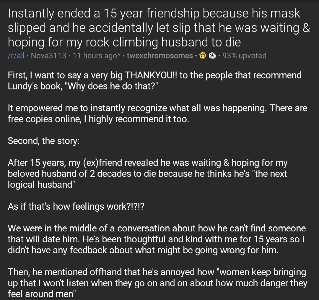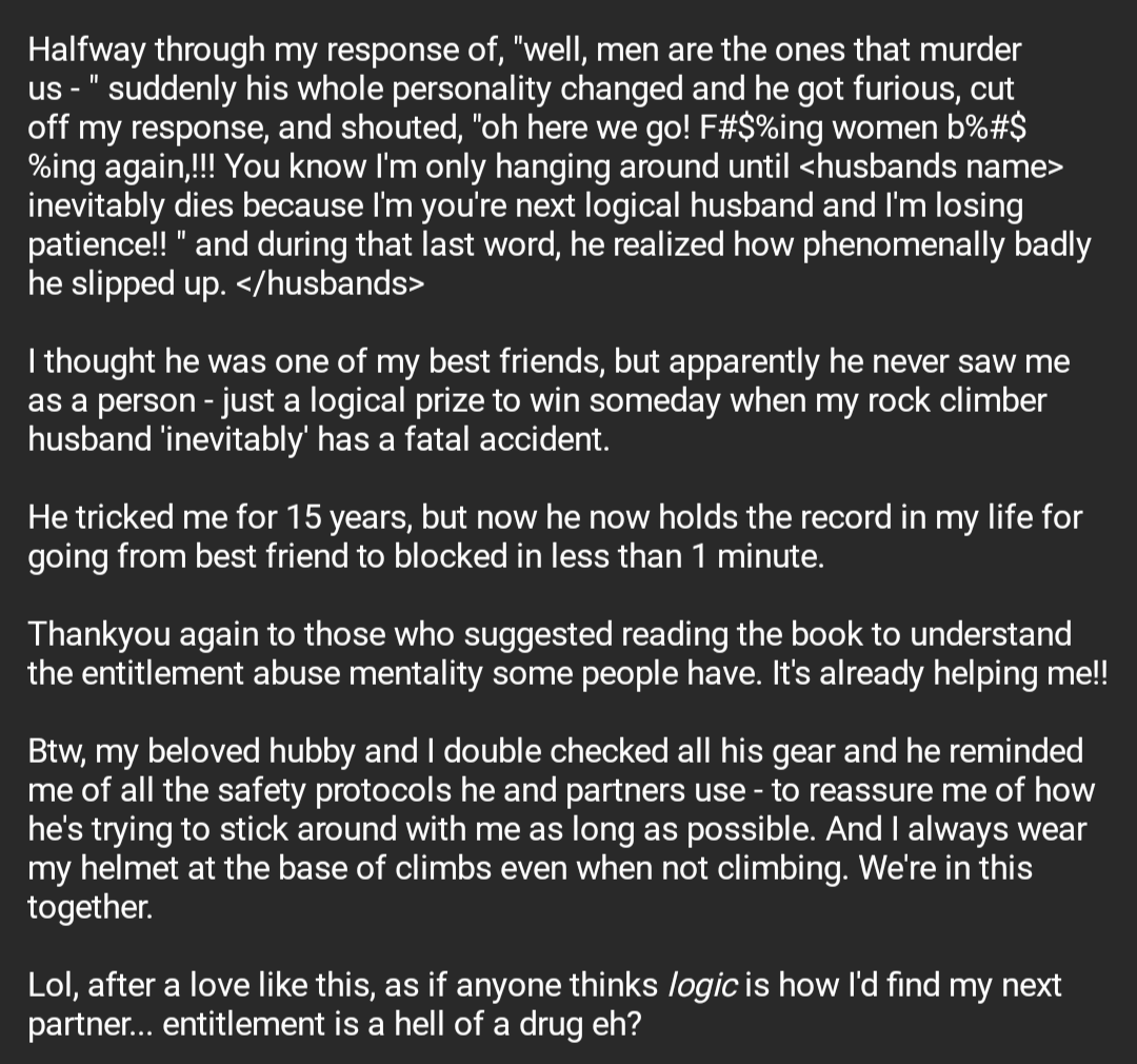 Instantly ended a 15 year friendship because his mask slipped and he accidentally let slip that he was waiting & hoping for my rock climbing husband to die https://www.reddit.com/r/twoxchromosomes/comments/u33msa …pic.twitter.com/BCbEwVXYGD