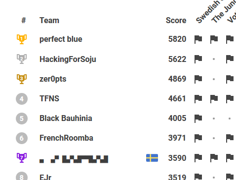 @redrocket_ctf and@OpenToAllCTF 2nd and 3rd. Congrats to everyone and thanks for playing! https://camp.allesctf.net/scoreboard Challenges will stay up for a few more days. Do writeups!#cccamp2019#cccamp19pic.twitter.com/3wmKCBkMwm