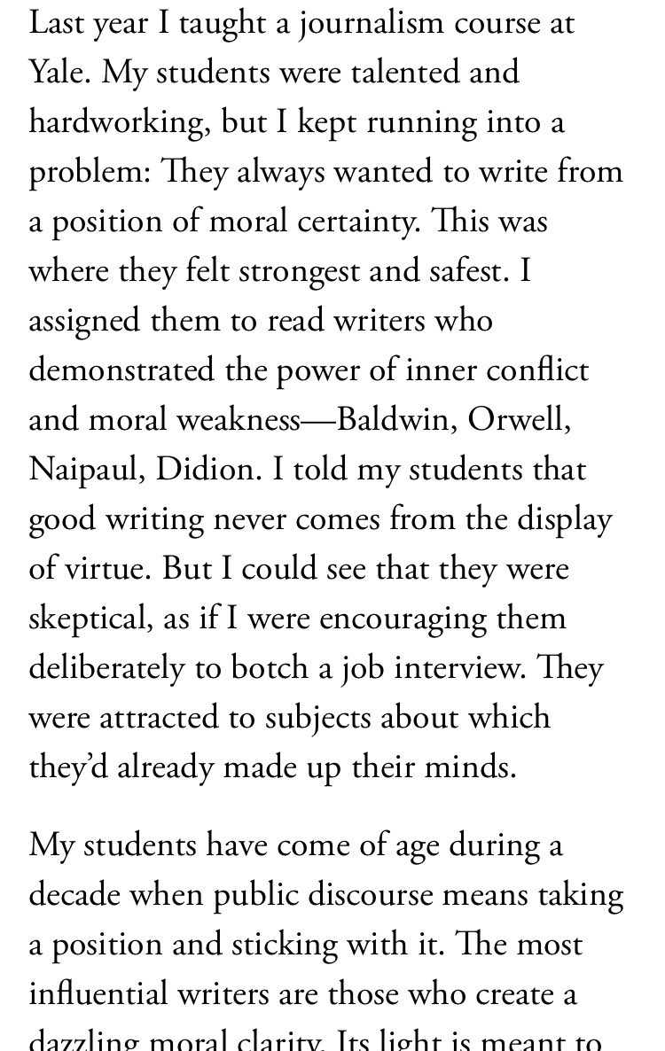 The smartest students in the world want to “write from a position of moral certainty...They were attracted to subjects about which they’d already made up their minds” Intelligence can be used to seek truth, nuance But its main purpose is computing how to boost social statuspic.twitter.com/rFVBmRx1dd