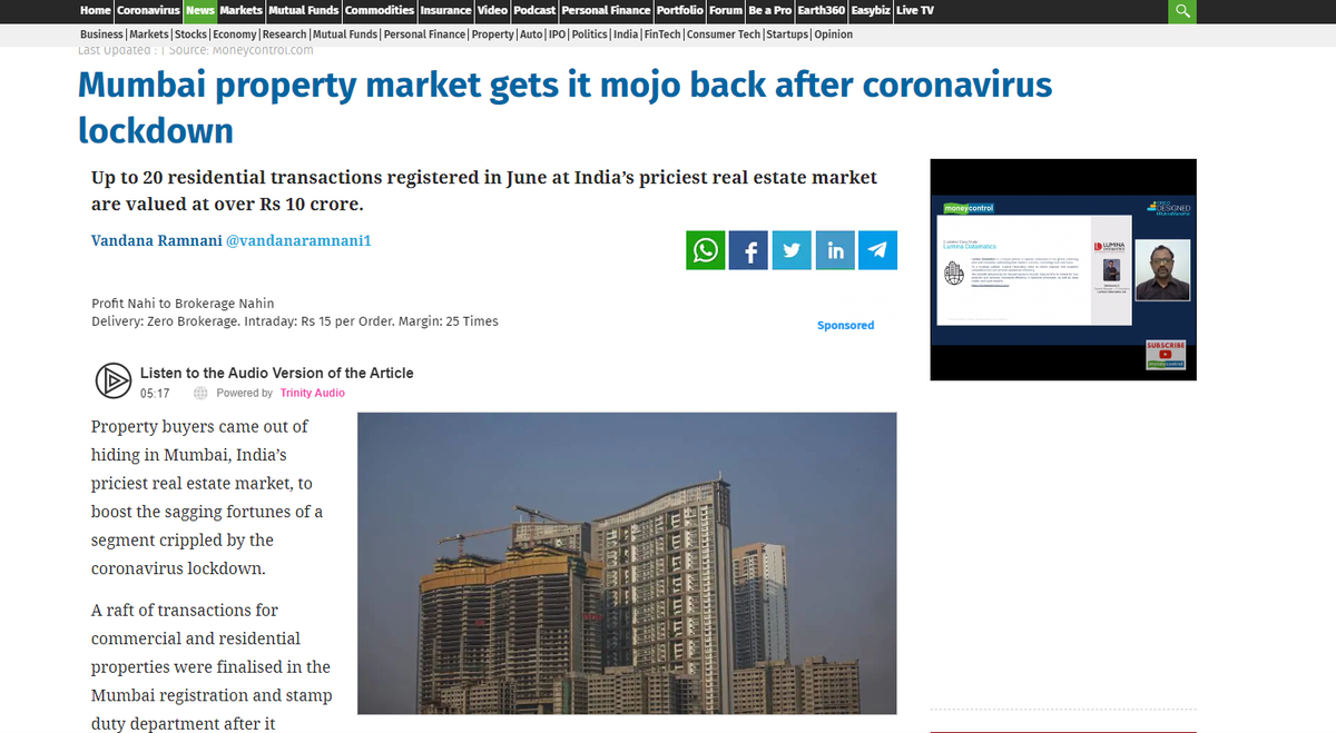 Mumbai property market gets it mojo back after coronavirus lockdown Property buyers came out of hiding in Mumbai, India’s priciest real estate market, to boost the sagging fortunes of a segment crippled by the coronavirus lockdown. Read more at:- https://www.moneycontrol.com/news/business/real-estate/mumbai-property-market-gets-it-mojo-back-after-coronavirus-lockdown-5535651.html …pic.twitter.com/yau6SACLVt
