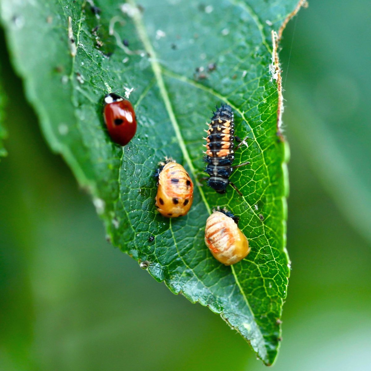 Larva and pupae are harlequin Harmonia axyridis, the adult is a 2-spot, Adalia bipunctata.