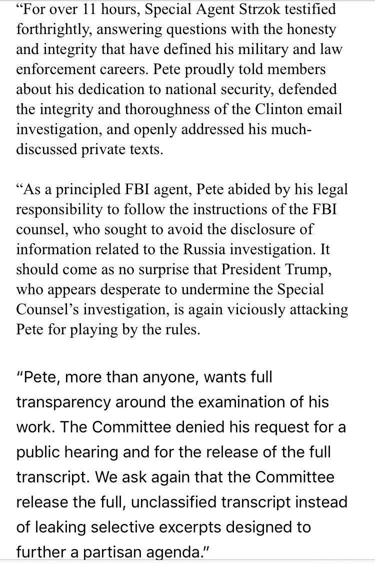 Statement from FBI agent Peter Strzok’s lawyer tonight after some House Republicans referenced in some detail Strzok’s closed door testimony from Wednesday in today’s public judiciary committee hearing:pic.twitter.com/1u9QVIXoEB