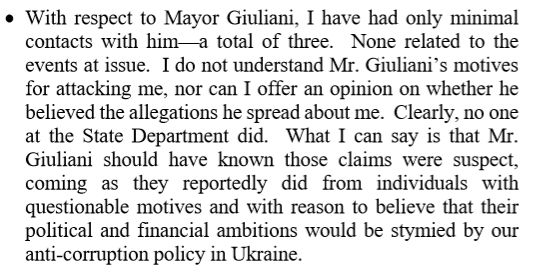 Amb Yovanovitch says in her opening statement that she does not understand Giuliani's motives for attacking her, nor whether he actually believed the allegations he was pushing.pic.twitter.com/Jxcd6jEGno