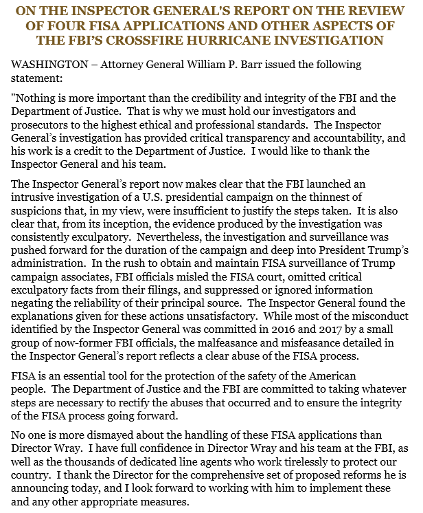 With release of DOJ IG's report, Attorney General Barr says FBI's Russia investigation "intrusive" and opened "on the thinnest of suspicions." DOJ IG concluded the FBI had sufficient information to open an investigation.pic.twitter.com/ecoWAv38pm
