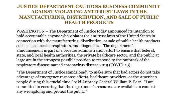 Justice Department issues a friendly reminder to the business community in light of coronavirus concerns:pic.twitter.com/qDRKHkXFNL