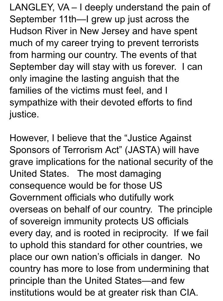 Here's statement from CIA director Brennan opposing #JASTA (which would allow lawsuits against #Saudi over 9/11).pic.twitter.com/4Xw3m8oiSB
