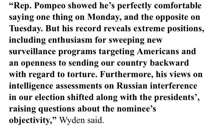 .@RonWyden making clear his concerns about CIA nominee @RepMikePompeo. Vote on nomination is this evening.pic.twitter.com/JS4U2XmqFv