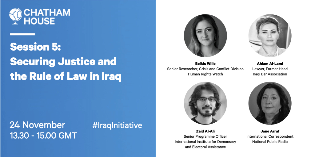 #IraqInitiative Session 5. Our next panel will discuss ways of securing justice and the rule of law in#Iraq.https://twitter.com/CH_MENAP/status/1329910421965443075 …