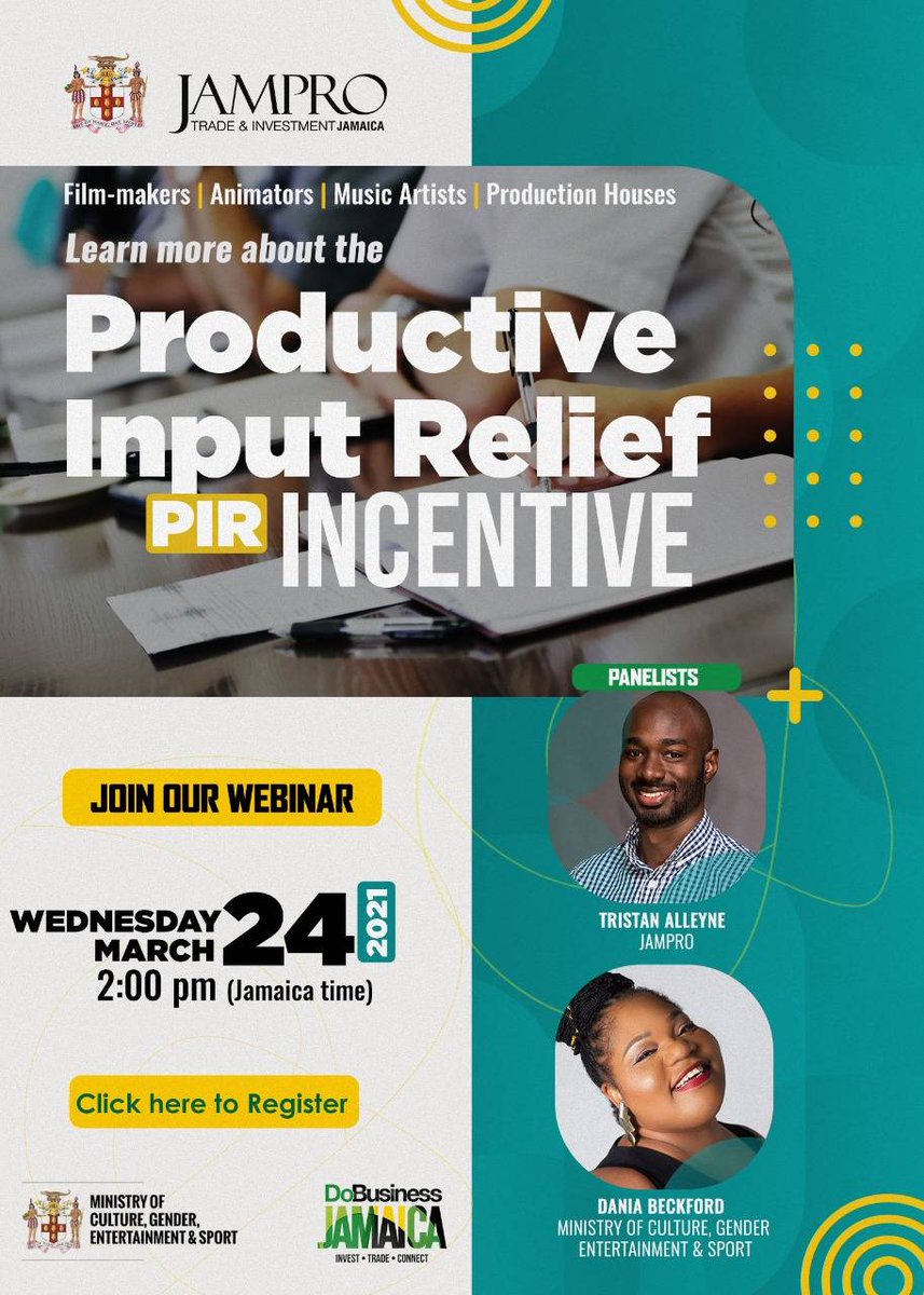 There actually is an incentive that allows the JA creative industry to expand their businesses. This webinar will tell you about the PRODUCTIVE INPUT RELIEF and how you can start benefiting now. Wed Mar 24 at 2pm (Bogota)