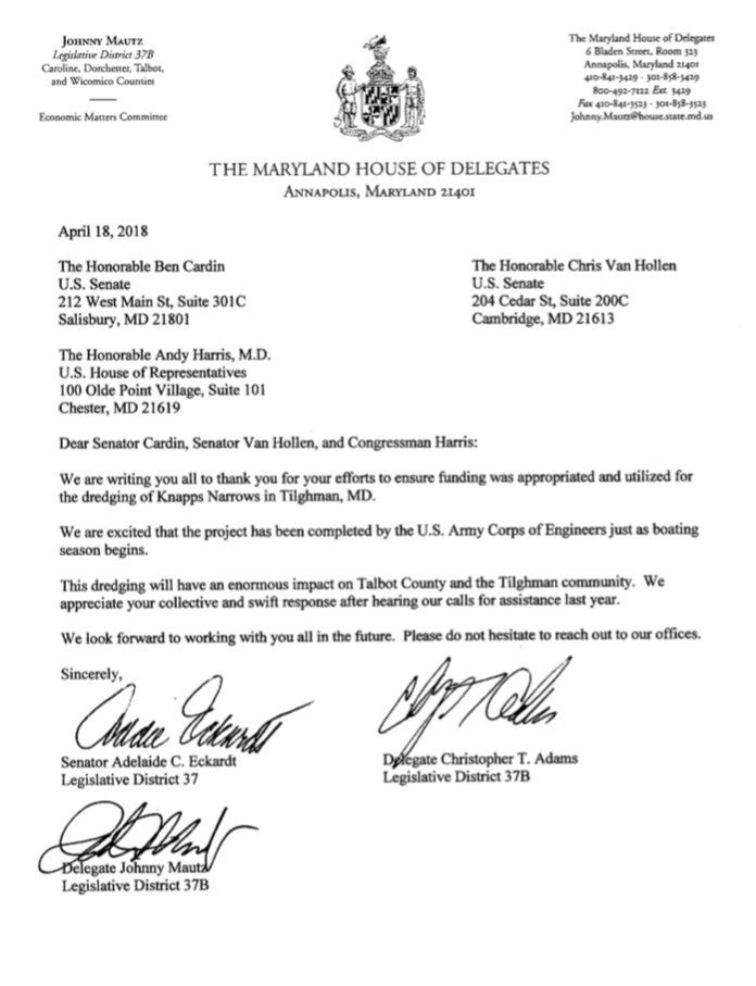 @USACEHQ for completing the dredging of Knapps Narrows. The people and small businesses in#MD01 who rely on Knapps Narrows for transporting goods and fishing will be able to conduct their business without interruption.pic.twitter.com/dOWKWHw59s