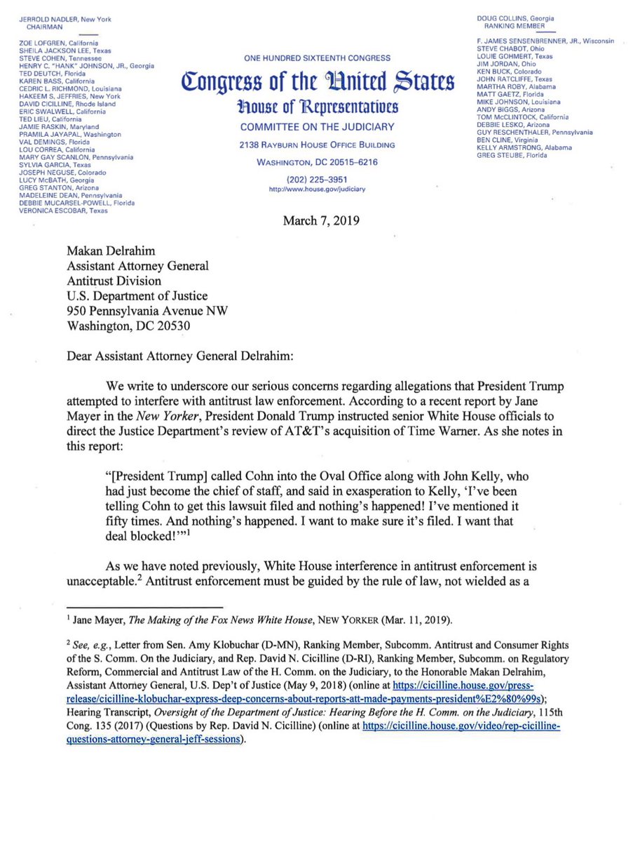 @RepJerryNadler Press for Answers on Whether White House Interfered with AT&T-Time Warner Merger to Help Fox News, Hurt CNNpic.twitter.com/Frkr7bztGb