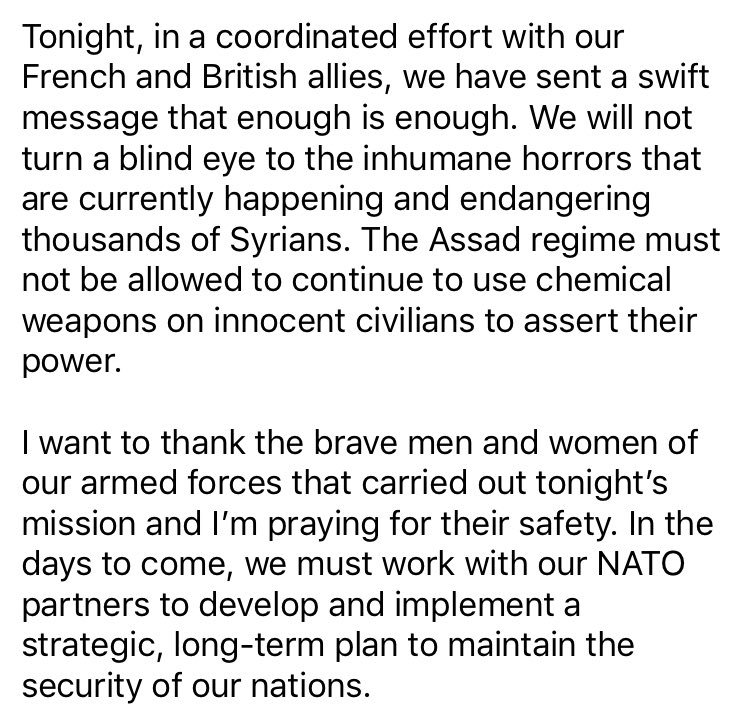 #WarPowersAct of 1973 is clear. Without an attack on the US or its forces, the president must seek Congressional authorization to attack. But your legislating via twitter?#SyriaStrikes#Syriapic.twitter.com/9y9Bu8CCMe