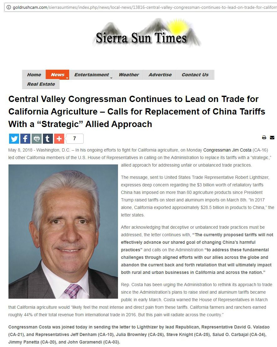 #SanJoaquin Valley,#CA, & the US. I will continue to call for a more strategic & comprehensive approach to address#trade imbalances, one that does NOT lead to a#TradeWar.@SIERRASUNTIMES: https://goo.gl/Ub781q pic.twitter.com/xFlkG1v0N6