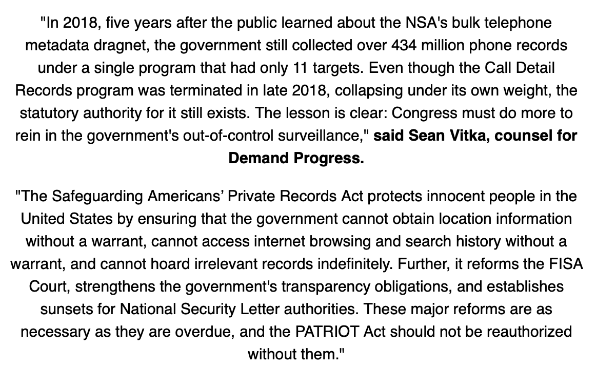 @SteveDaines@RonWyden and@RepZoeLofgren@RepJayapal@WarrenDavidson The bill would enact long overdue surveillance reforms, including to#Section215 of the#PATRIOTAct https://mailchi.mp/demandprogress/demand-progress-endorses-fisa-reform-bill?e=[UNIQID …]pic.twitter.com/Ot4vHMkaNg