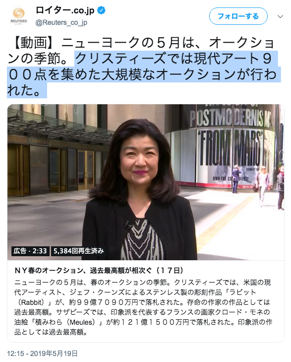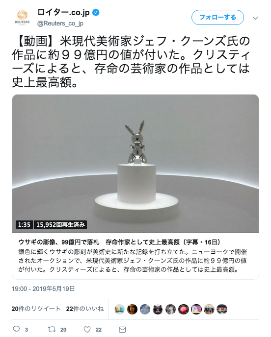 日運コード98予言「15日・16日はうさぎに関する世界的大ニュースが報じられる」がコード99数解き「史上最高の落札額99億円」とセットで完全同時現象化! 【競売大手クリスティーズで15日】 スティール製のウサギの彫刻が99億円で落札 存命美術家の作品としては史上最高額(スポニチ)2019年5月16日pic.twitter.com/pfgnrV4IDq