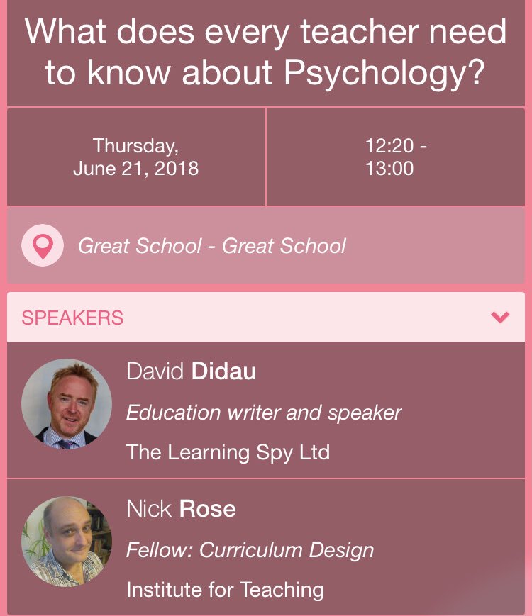 @JohnCattEd conversation with@Nick_J_Rose &@DavidDidau on their book: 'What Every Teacher Needs to Know about Psychology' at#Educationfest tomorrow. Great School: 12:20. Don't miss it!pic.twitter.com/tSf7tCBsGl