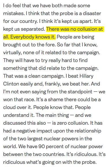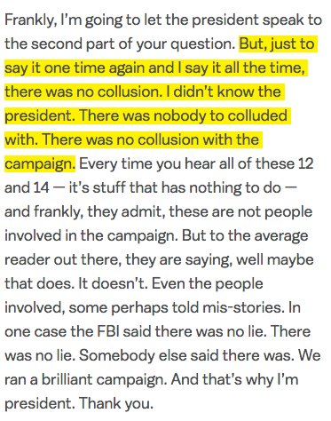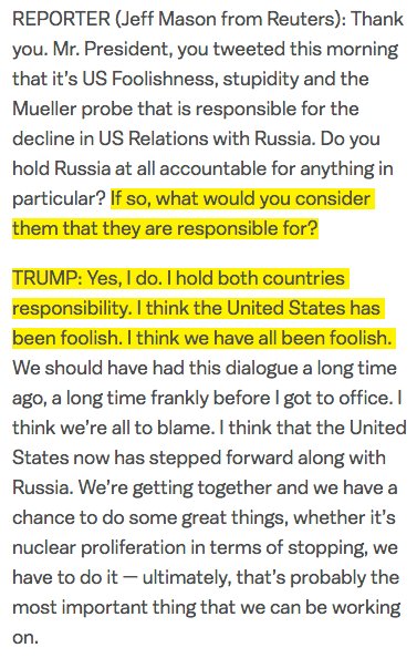 To belabor the point: here is the relevant section of the transcript from Trump's press conference with Putin in Helsinki. There is no "other question" he could have been replying to. You cannot change the meaning of this sentence by adding "wouldn't". It was unambiguous.pic.twitter.com/e8K9fasjDs