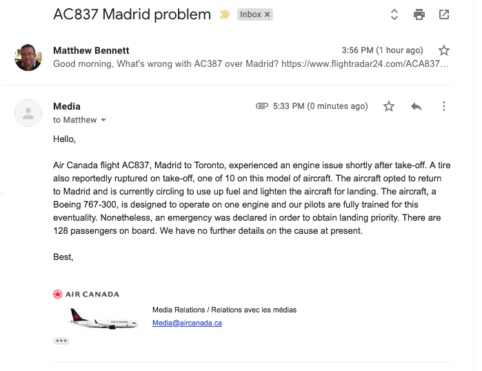 First statement from Air Canada on emergency with flight AC837 over Madrid. Email to me just now: "Air Canada flight AC837, Madrid to Toronto, experienced an engine issue shortly after take-off. A tire also reportedly ruptured on take-off, one of 10 on this model of aircraft…"pic.twitter.com/zdeg78vpNX
