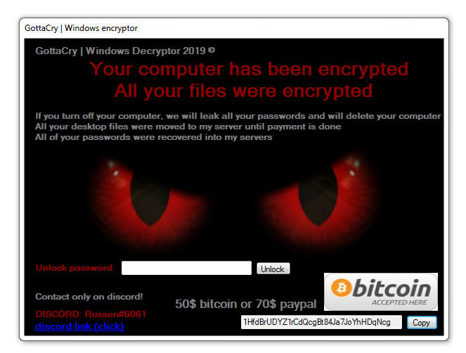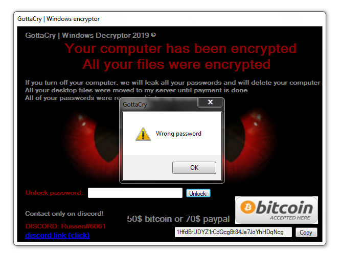 GottaCry ransomware sample: https://www.virustotal.com/en/file/74f9b8d8ad9cd5da148c4459560be843ee9443bf01e2bc7dff77fb333a470196/analysis/1558045070/ … Not encrypts anything, but has this "DeleteDesktop"... Anything entered in the textbox, it will only show "Wrong password" message. "Contact only on discord!"